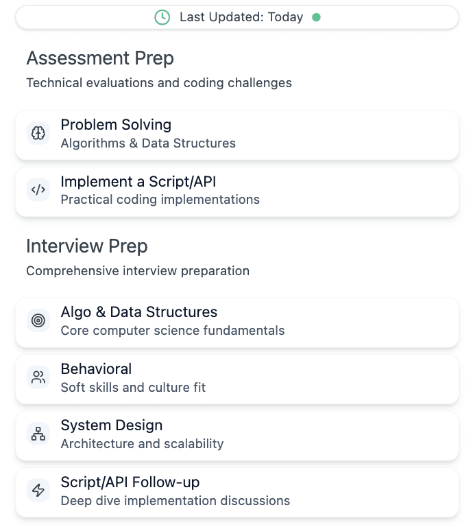 Our team does the grunt work of scouting for most relevant interview and assessment problems so you’re always preparing with up-to-date, real questions.