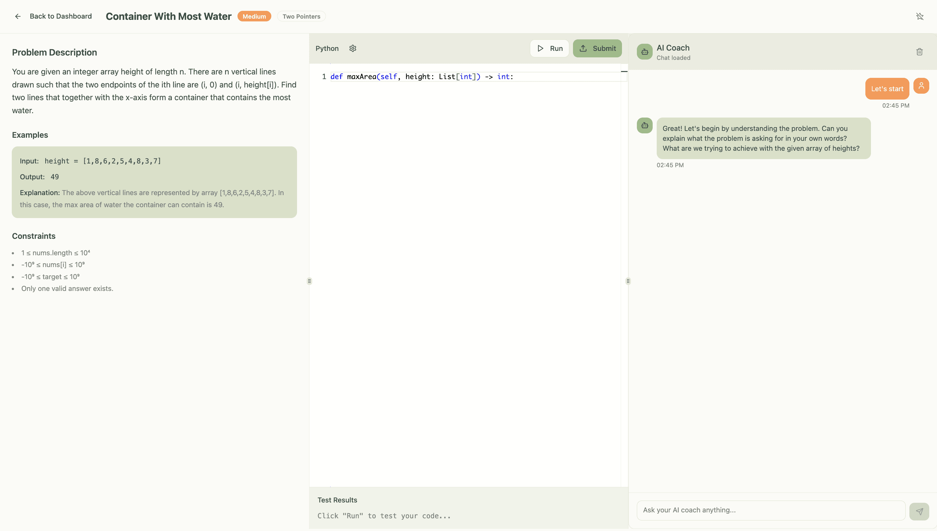 An AI-powered coding coach that helps you learn to solve interview problems using first principles—not brute-force memorization.